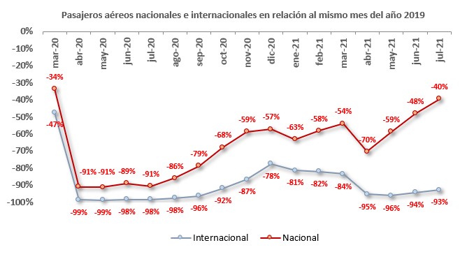 “A nivel internacional, debido al cierre de fronteras, es donde mayormente se aprecia una baja cercana al 93% en el tráfico de pasajeros. En cambio, a nivel nacional, esta caída se reduce a un 39,5%, que a pesar de seguir bajo el 2019, representa una mejora por tercer mes consecutivo y representa el mejor resultado desde abril de 2020, lo que coincide con los procesos de apertura del plan Paso a Paso y sobre todo la habilitación del Pase de Movilidad” detalló el Secretario General de la Junta de Aeronáutica Civil, Martín Mackenna.