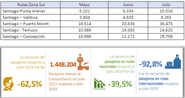 A los tradicionales destinos del Norte Grande impulsados por la industria minera, la JAC destacó la reactivación de rutas en la zona sur, donde en algunas zonas se triplicó el número de pasajeros en comparación al mes de mayo, como es el caso de Santiago – Punta Arenas que pasó de 5.101 a 15.016 en el mes de julio.